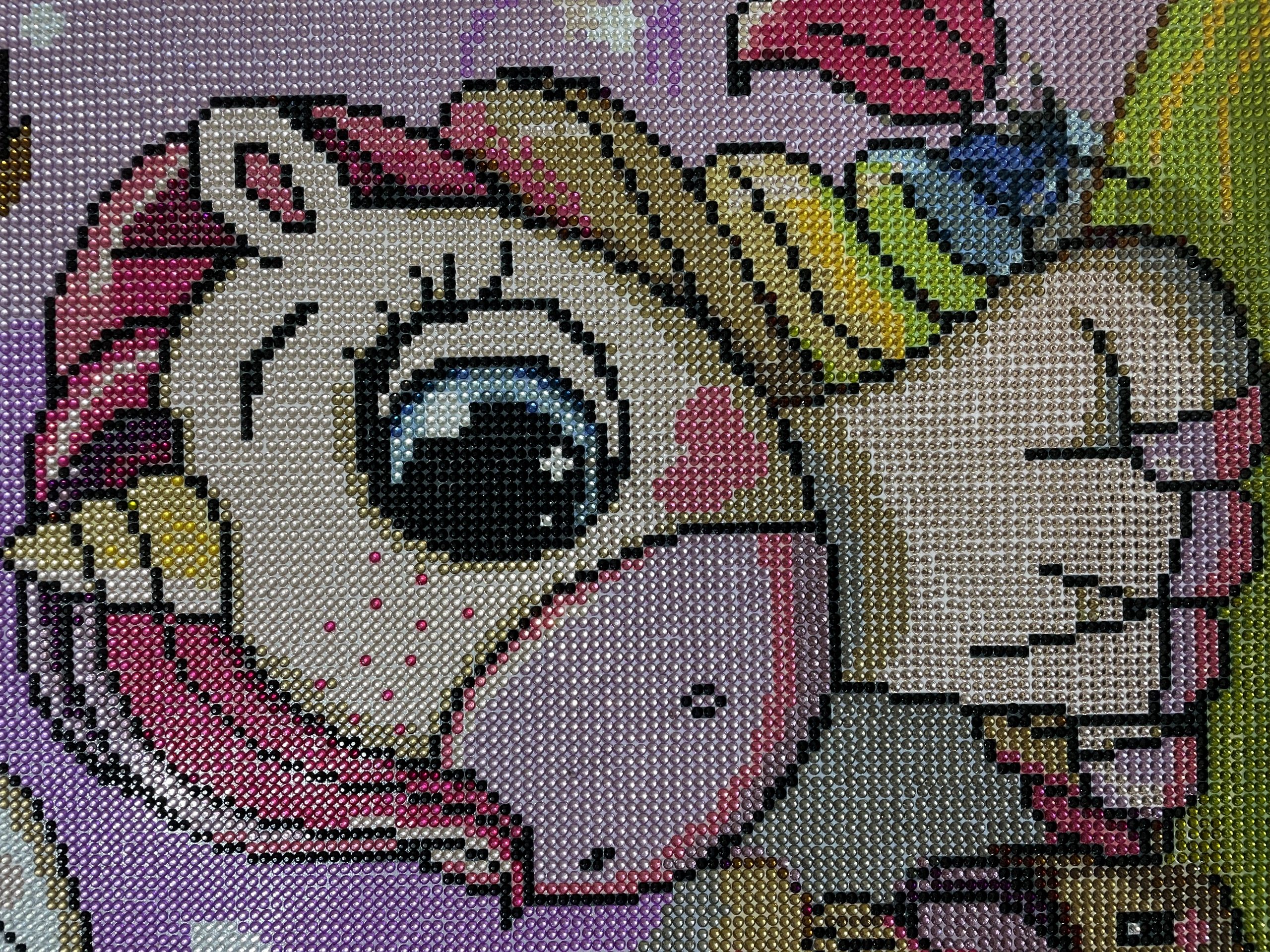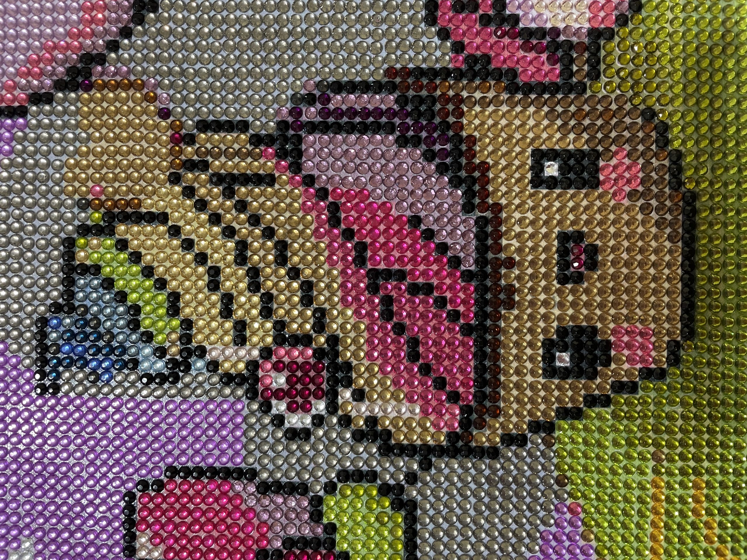 Crystals Crystals Crystals This was my first of three purchased whole crystal canvas diamond painting, and I was not disappointed in the final result. It was fun bright and colorful. Had my attention all the the way till the end. My one little complaint would be that there were a lot of damaged drills, and oversized and undersized drills to, which is to be expected, but so much that that I almost ran out of a certain drills cause it wouldn't had fit properly on the canvas which caused popping but overall I loved how it came out, got two more to go and ready to purchase a few more.